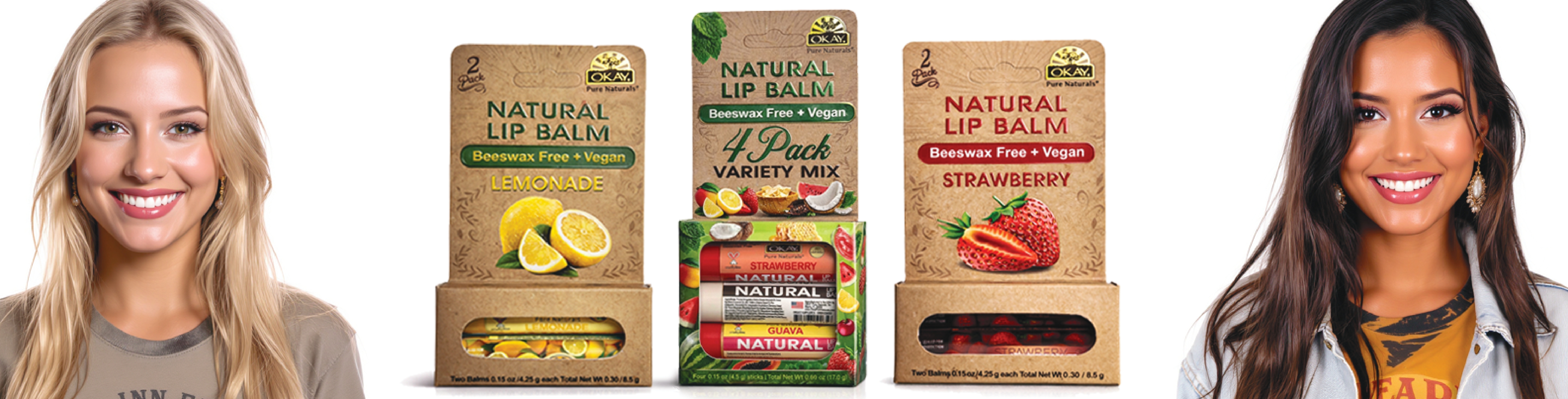 OKAY Pure Naturals 4 Pack- Natural Lip Balm-Variety Mix- Beeswax Free + Vegan - 2 x 0.15 oz / 4.25 gr